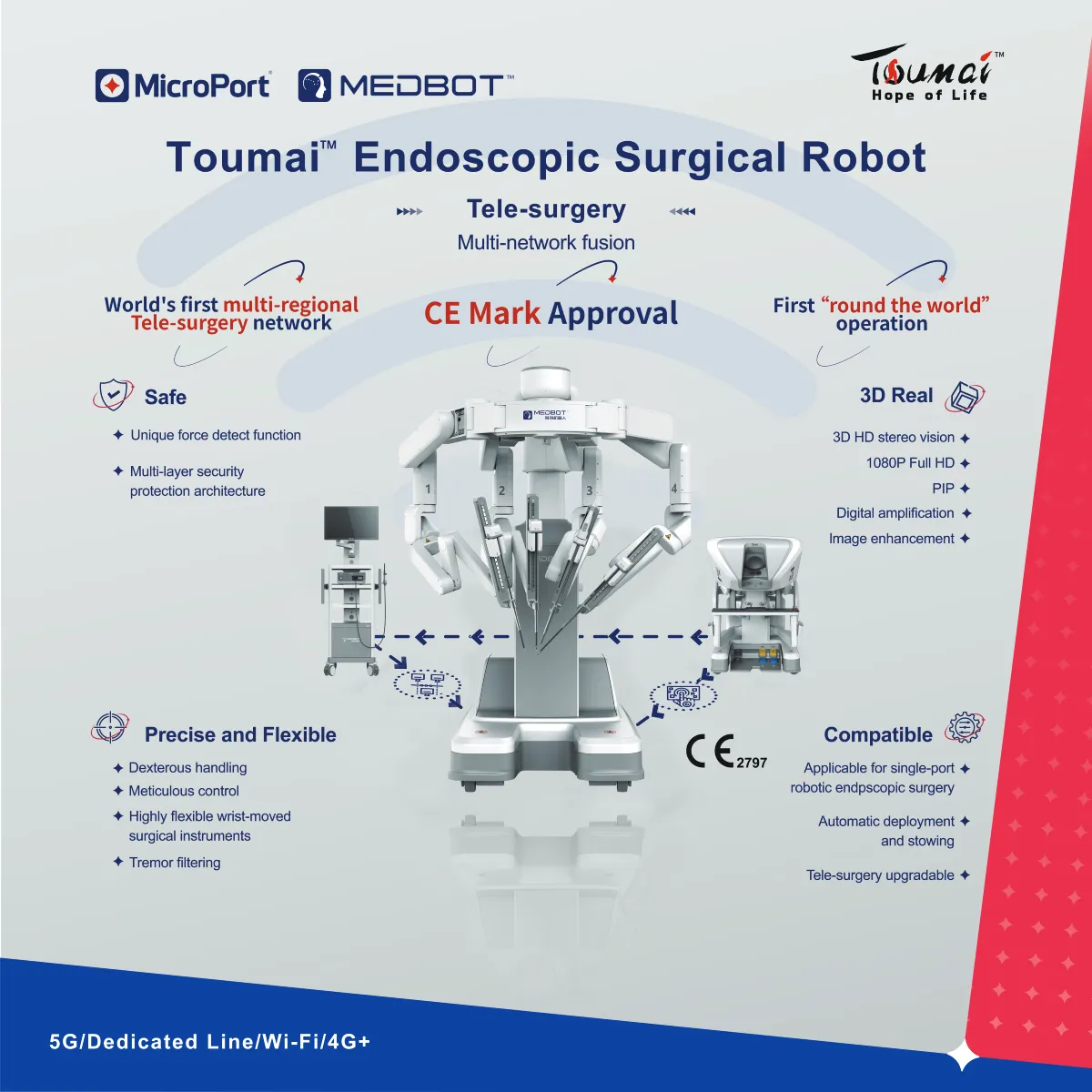 Toumai también marca una diferencia importante en el campo de la telecirugía. Es actualmente la única plataforma robótica con certificación para realizar telecirugía, un logro que refleja el nivel de madurez tecnológica alcanzado por MedBot – MicroPort. Este sistema ya fue implementado en más de 30 hospitales de distintas ciudades, acumulando una red operativa que supera los 150.000 km de comunicación entre centros quirúrgicos. Estos avances consolidan a Toumai como un referente global en conectividad, precisión a distancia y nuevas posibilidades para la formación y asistencia quirúrgica remota.